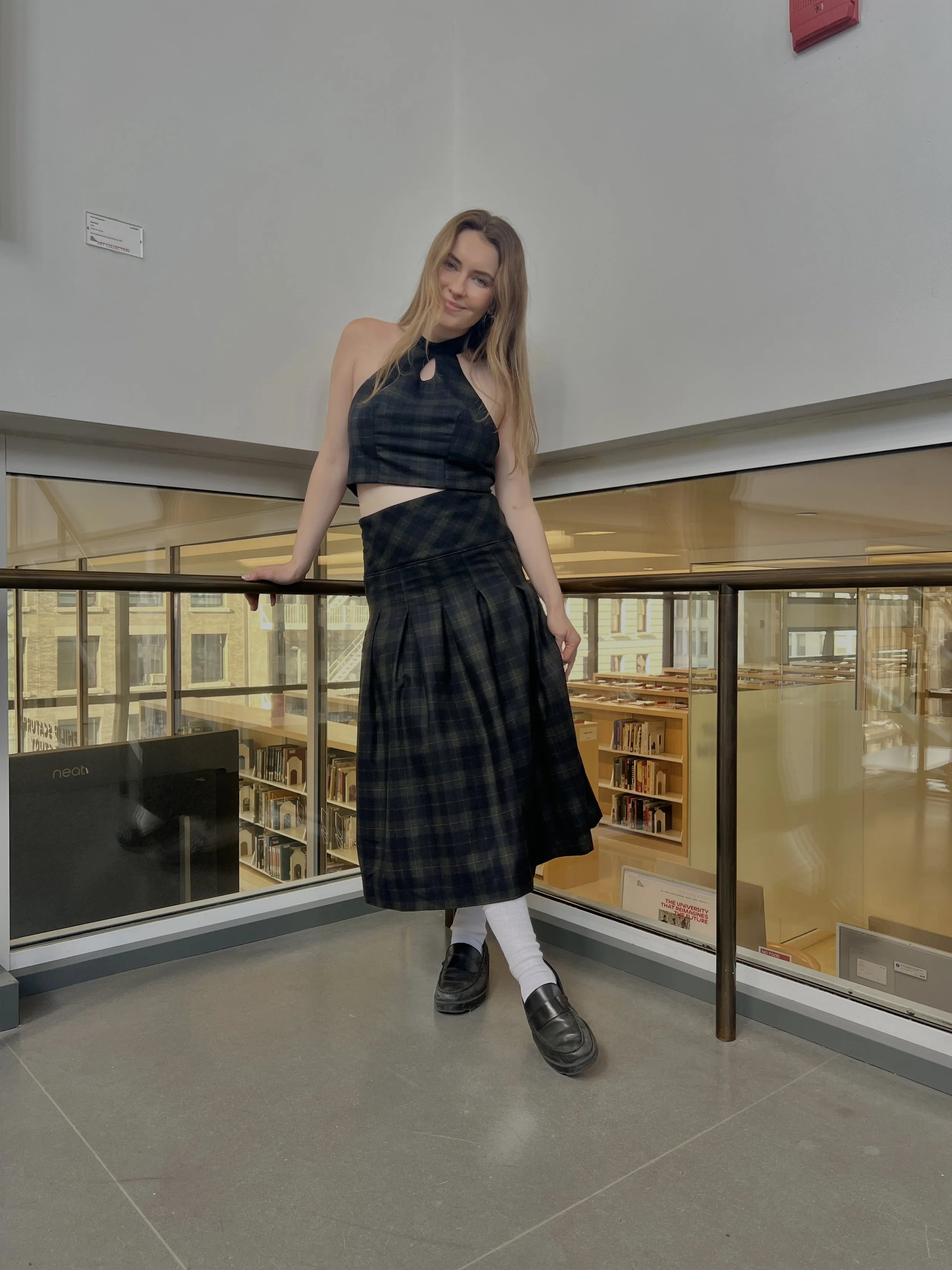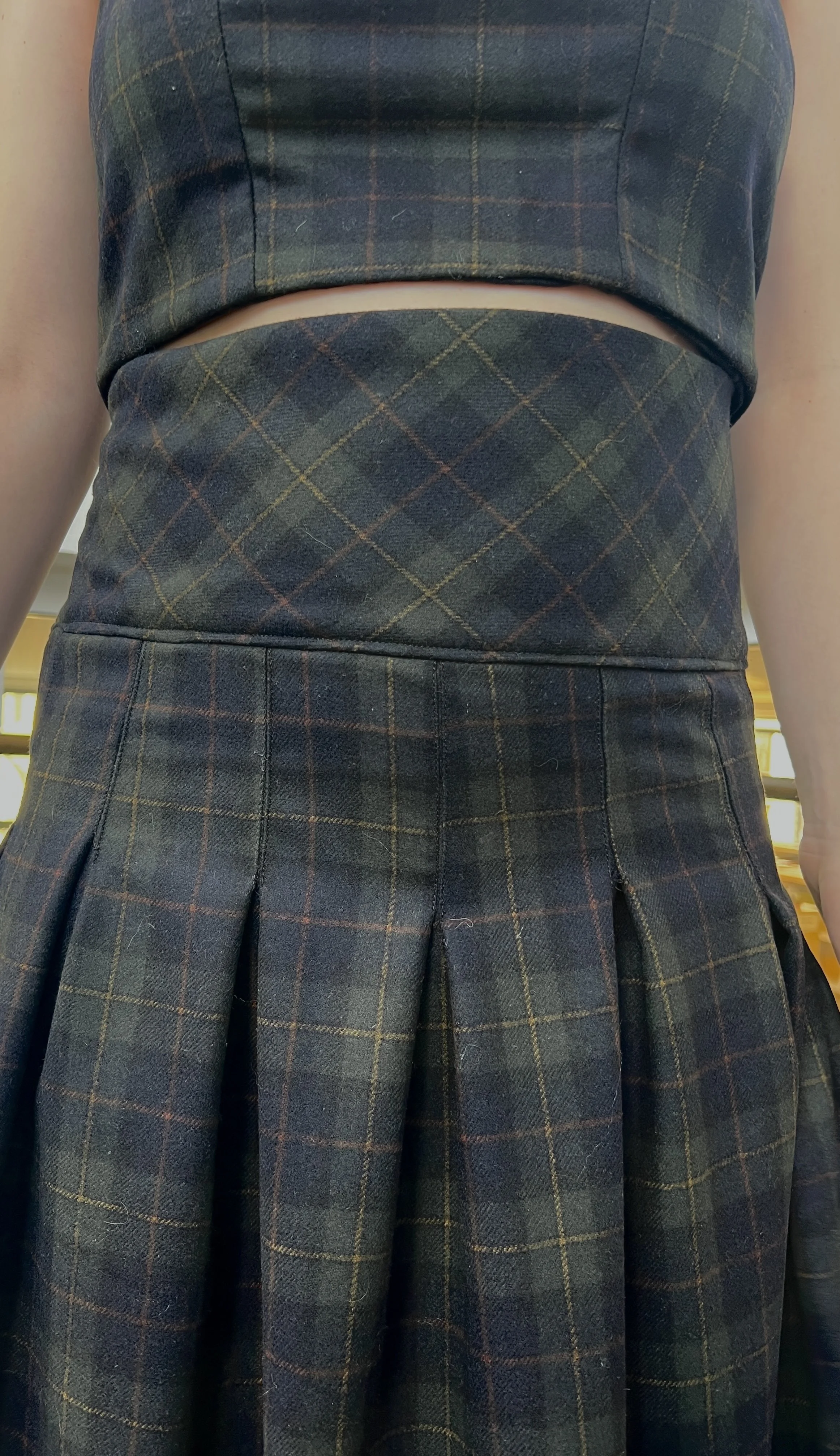 Featuring inverted box pleats with a 3 inch topstitch that transforms the pleats into tucks, this wool plaid skirt was crafted in Italy from 98% wool and 2% cashmere. Paired with the plaid wool halter for a fresh take on a traditionally preppy fall look.